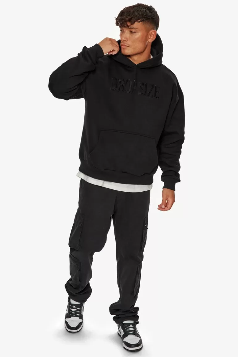 Best Sale Dropsize Heavy Oversize Flat Front Embo Hoodie Black